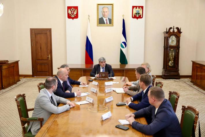 Глава КБР Казбек Коков провёл встречу с первым заместителем генерального директора компании «РТ-Развитие бизнеса» (дочерняя компания ГК «Ростех») Андреем Захаровым и генеральным директором «Эльбрусметалл» Евгением Балуковым, а также членами команды инвесторов.