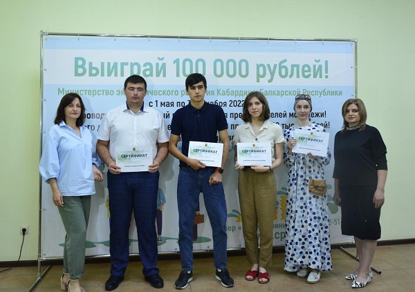 Заместитель министра экономического развития КБР Ольга Белецкая и директор центра «Мой бизнес» Мадина Дудуева вручили сертификаты на 100 тысяч рублей победителям первого этапа акции. Ими стали: Астемир Тауков, Алина Шарибова, Адмир Шогенов, Амина Арданова.