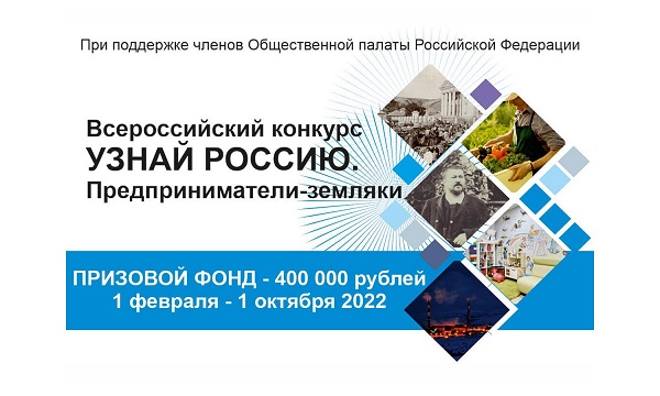 Всероссийский конкурс «Узнай Россию. Предприниматели-земляки» проводится при поддержке членов Общественной палаты Российской Федерации . Его цель - развитие у школьников и студентов предпринимательского, критического и креативного мышления, побуждение интереса к предпринимательской деятельности, а также популяризация деятельности предпринимателей и их роли в развитии местных сообществ.