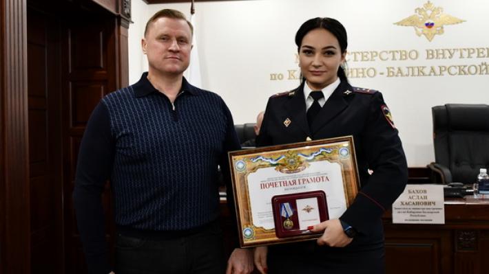 Завершилось мероприятие церемонией награждения. За добросовестное выполнение служебных обязанностей и высокие показатели в служебной деятельности Почётной грамотой МВД по КБР награждены главный инспектор инспекции штаба республиканского МВД Роман Глущенко, начальник штаба ОМВД России по Черекскому району Залимхан Кульбаев и старший инспектор по особо важным поручениям штаба МВД по КБР Карина Бесланеева.