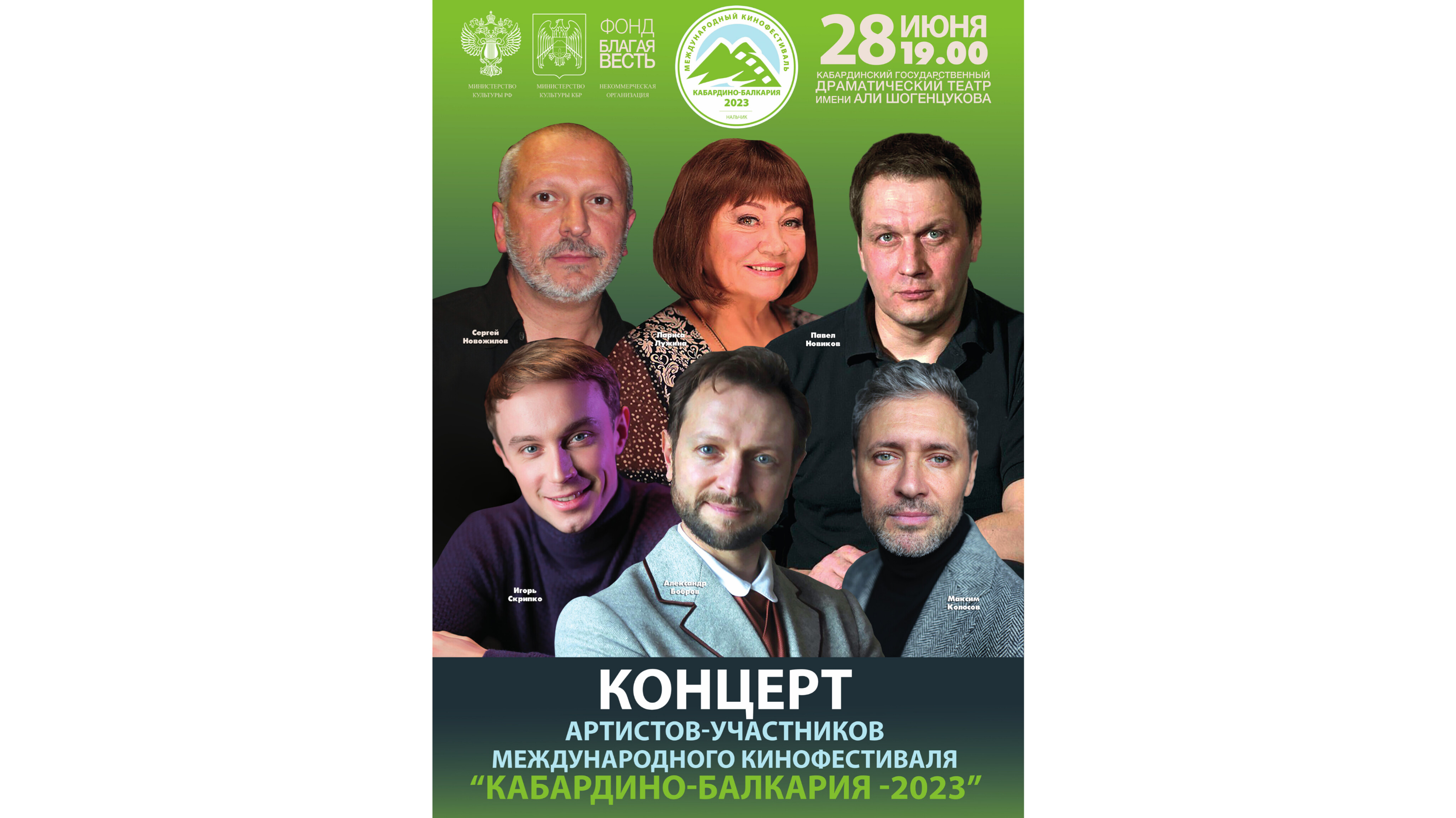 В Кабардинском государственном драматическом театре им. А. Шогенцукова в рамках Международного кинофестиваля «Кабардино-Балкария -2023» 28 июня пройдет концерт с участием звезд театра и кино: Максимом Колосовым, Александром Бобровым, Павлом Новиковым, Игорем Скрипко, Народной артистки РФСР Ларисой Лужиной, Заслуженным деятелем искусств Сергеем Новожиловым