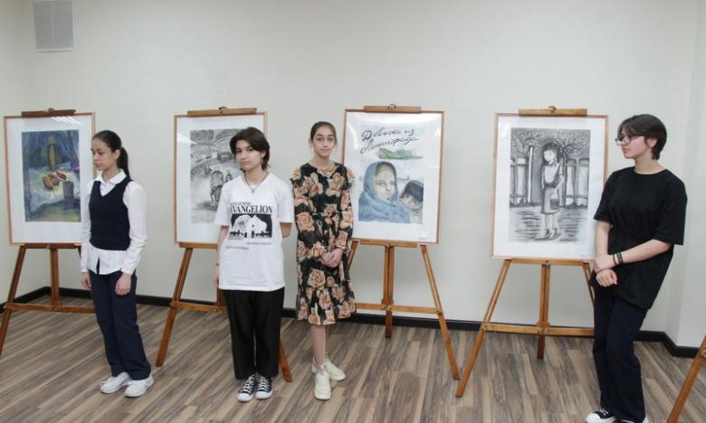 Акция «Читаем детям о войне» - крупномасштабное мероприятие по поддержке чтения, воспитанию гражданственности у детей и подростков на примере лучших образцов литературы о Великой Отечественной войне. Это произведение о тяжелом периоде военной оккупации, основанное на истории девочки Раи, эвакуированной из Ленинграда в Нальчик. События, стремительно наслаивающиеся одно на другое, заставляют ребенка повзрослеть раньше времени. Однако даже в самые тяжелые моменты окружающие девочку люди помогают справиться с выпавшими на ее долю трудностями. Все это нашло отражение в полотнах воспитанников школы искусств: укутанные в теплые одежды фигуры бабушки и внучки, печать скорби на их лицах, сцены боев и бомбежек, огарок свечи и несколько кусочков черного хлеба. В графических и живописных работах детально проработаны объекты, которые ярко передают сопереживание авторов героям книги.