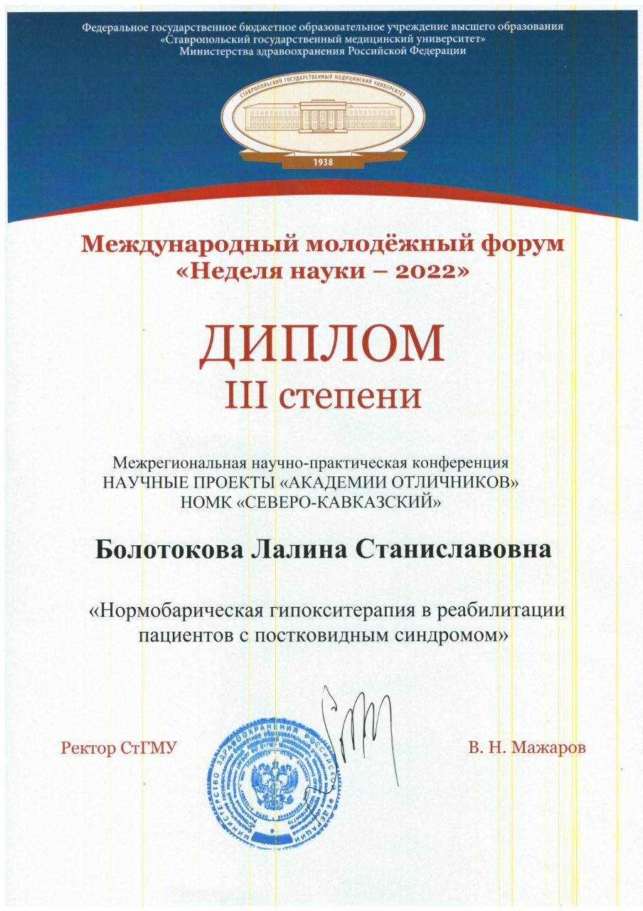 В рамках Международного молодежного форума «Неделя науки – 2022» состоялась межрегиональная научно-практическая конференция «Научные проекты «Академии отличников» НОМК Северо-Кавказский», по итогам которой студентка 4 курса медицинского факультета Кабардино-Балкарского государственного университета им. Х.М. Бербекова Лалина Болотокова Станиславовна получила Диплом III степени, представив научный проект «Нормобарическая гипокситерапия в реабилитации пациентов с постковидным синдромом».
