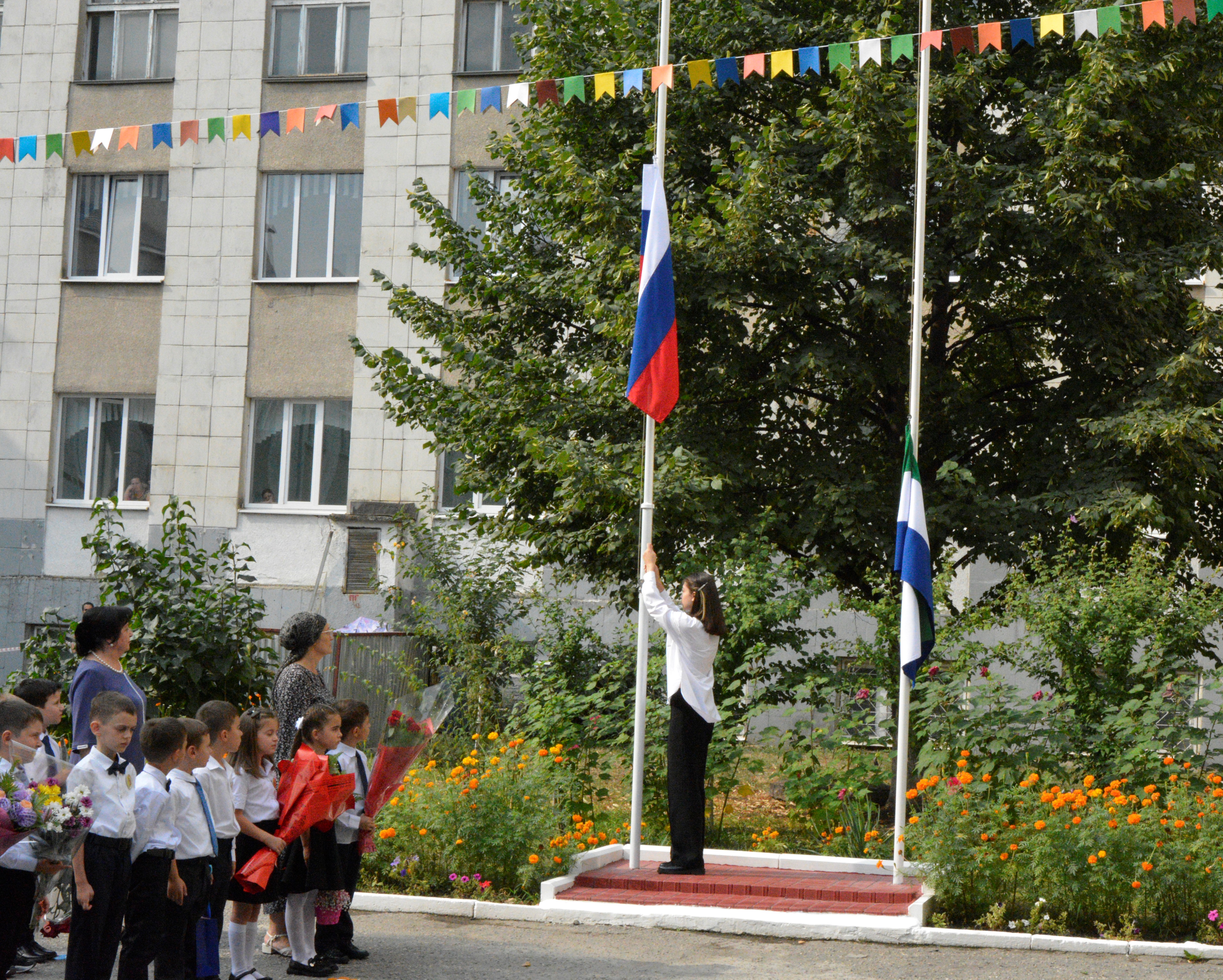 Первого сентябрьская торжественная линейка началась с поднятия флагов. Начиная с этого учебного года, новая неделя во всех школах страны будет начинаться именно так.
