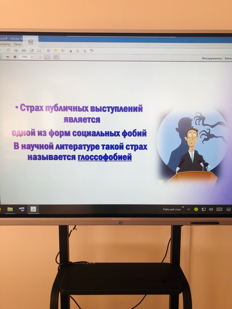 Слушатели из числа студентов КБГУ узнали, что такое глоссофобия и почему она возникает. Лектор пояснила, что причины страха публичных выступлений различаются в зависимости от личностных особенностей. Это может быть и психологическая травма из детского возраста; и неудачный опыт, связанный с выступлением на публике; и низкая самооценка и неуверенность в себе; и страх общественного неодобрения и порицания; и стресс, депрессия; и последствия черепно-мозговой травмы или иных заболеваний и т.д.