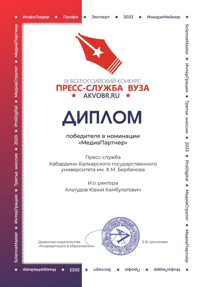 Подведены итоги девятого этапа Всероссийского конкурса «Пресс-служба вуза», в котором Кабардино-Балкарский государственный университет им. Х. М. Бербекова стал победителем в номинации «МедиаПартнер».