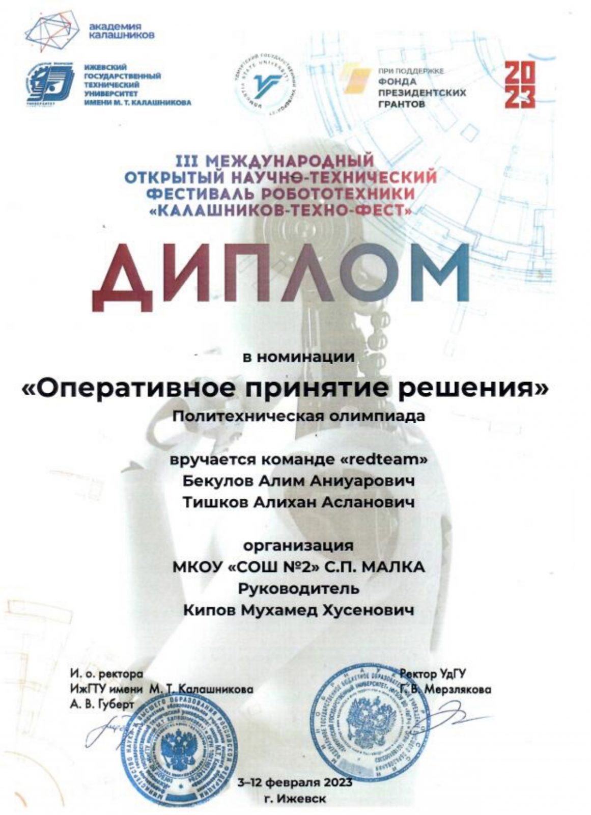 Команда института информатики, электроники и робототехники Кабардино-Балкарского государственного университета им. Х.М. Бербекова стала победителем в номинации «Оперативное принятие решения» III Международного открытого научно-технического фестиваля робототехники «Калашников–Технофест», который проходил с 7 по 11 февраля 2023 года в Ижевском государственном техническом университете им. М.Т. Калашникова.