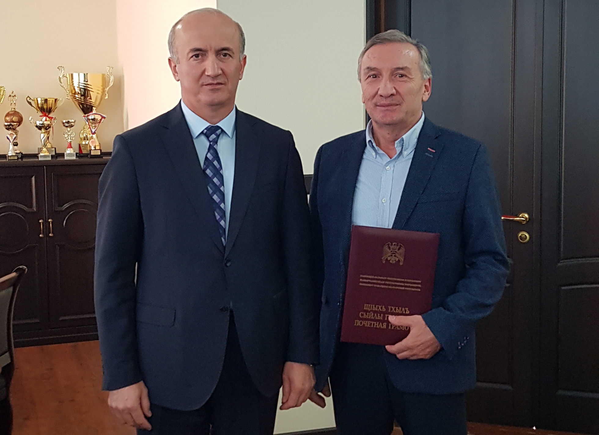 Почётную грамоту Парламента КБР из рук ректора вуза Аслана Апажева получил доцент кафедры продуктов питания из растительного сырья торгово-технологического факультета Алихан Мукожев.