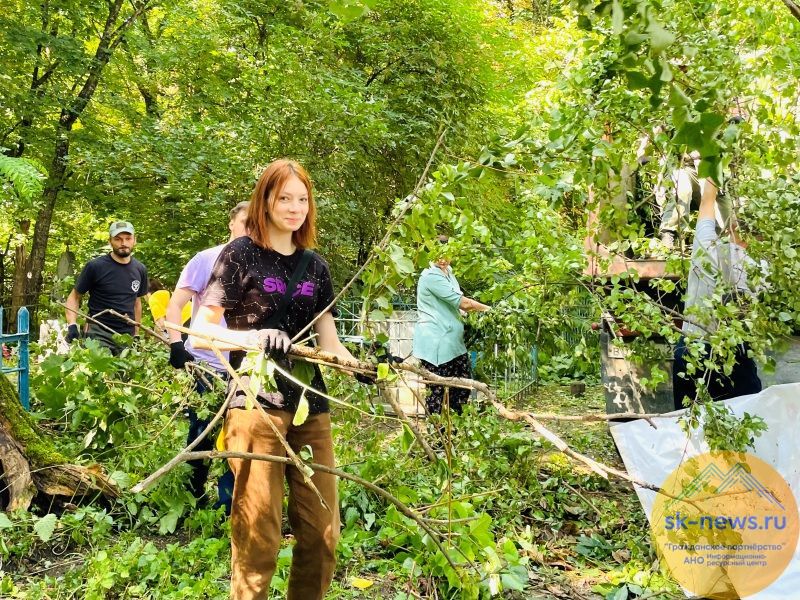 На фото пресс-службы комитета по делам национальностей и казачества молодые волонтёры в Ставрополе очищают от веток и мусора памятник культурного наследия.