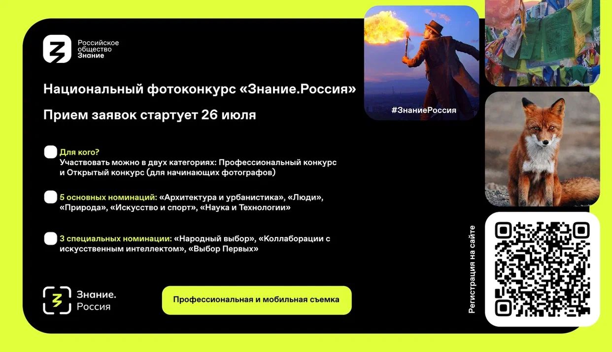 26 июля 2023 года во всех регионах страны стартует национальный фотоконкурс Знание.Россия, призванный через фотографии показать достижения нашей страны в XXI веке.