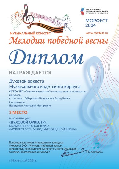 Духовой оркестр Музыкального кадетского корпуса СКГИИ занял 3 место на Всероссийском музыкальном молодежном конкурсе «Мелодии победной весны», который прошел в рамках Юбилейного музыкального молодежного фестиваля «Морфест-2024».