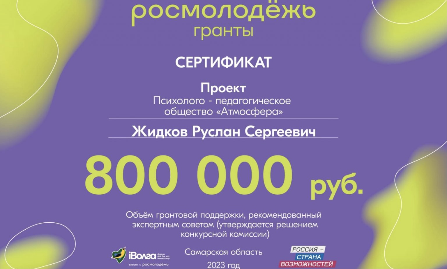 Проект Руслана Жидкова «Психолого-педагогическое общество «Атмосфера» вызвал большой интерес и поддержку экспертов «Росмолодежи.Гранты» и получил грант в размере 800 000 рублей в номинации «Делись опытом»,