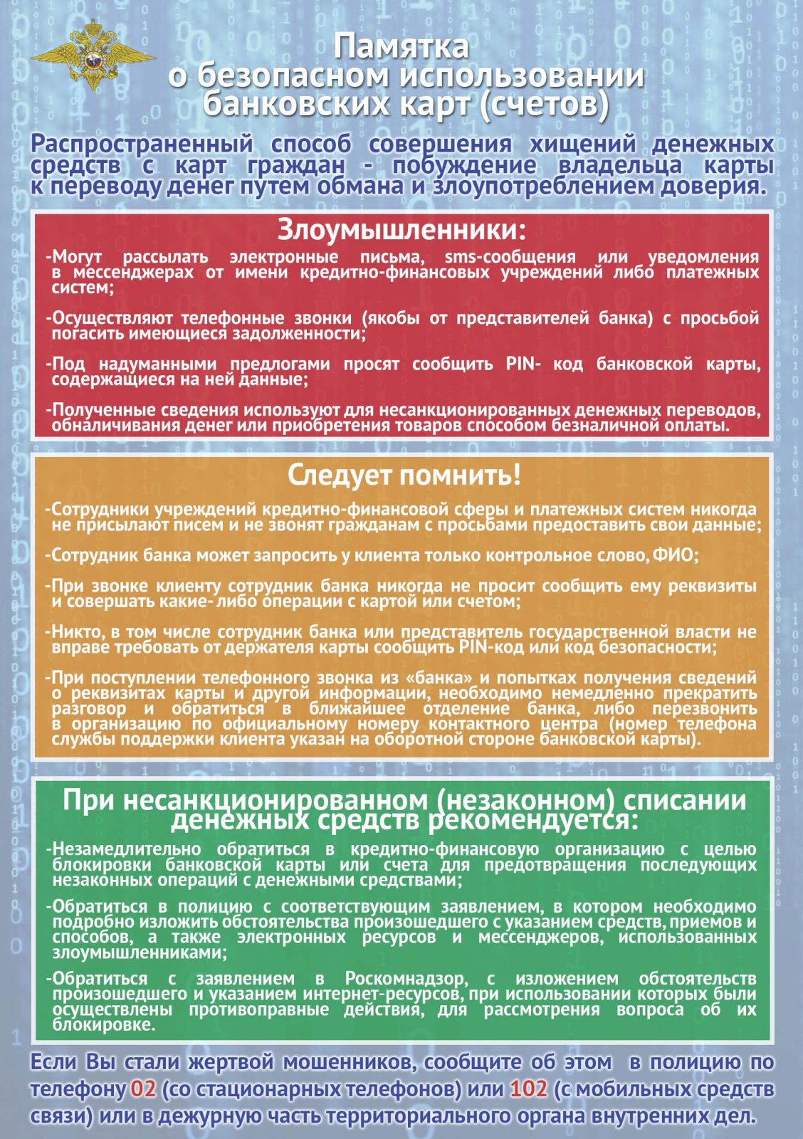 Внимание! Помните, работник банка никогда не попросит у вас конфиденциальные сведения: полные реквизиты карты (номер карты, ПИН- и CVV-код), СМС-пароли банка; никогда не требует совершать операции с картой.