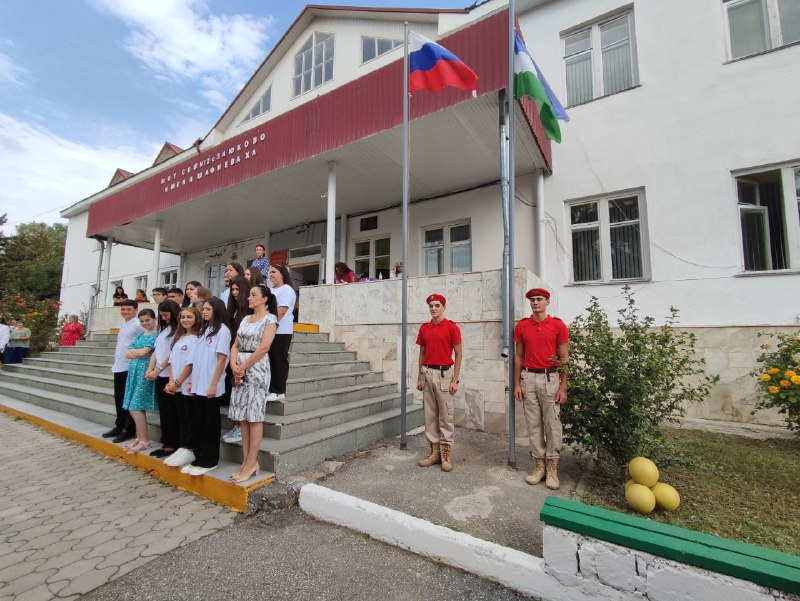 Новый учебный год в этом году начался с исполнения гимнов и поднятия флагов Российской Федерации и Кабардино-Балкарской Республики, которые в торжественной обстановке подняли юнармейцы школы.