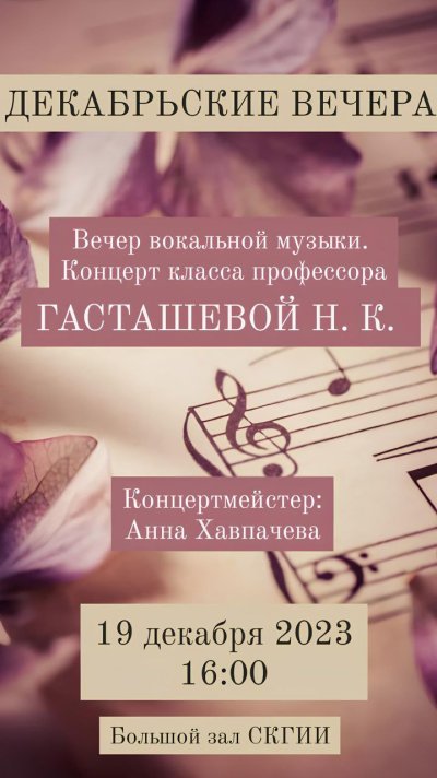 19 декабря 2023 года в Большом зале Северо-Кавказского государственного института искусств состоится концерт класса заведующей кафедрой вокального искусства и дирижирования СКГИИ, профессора, народной артистки РСФСР Наталии Гасташевой .
