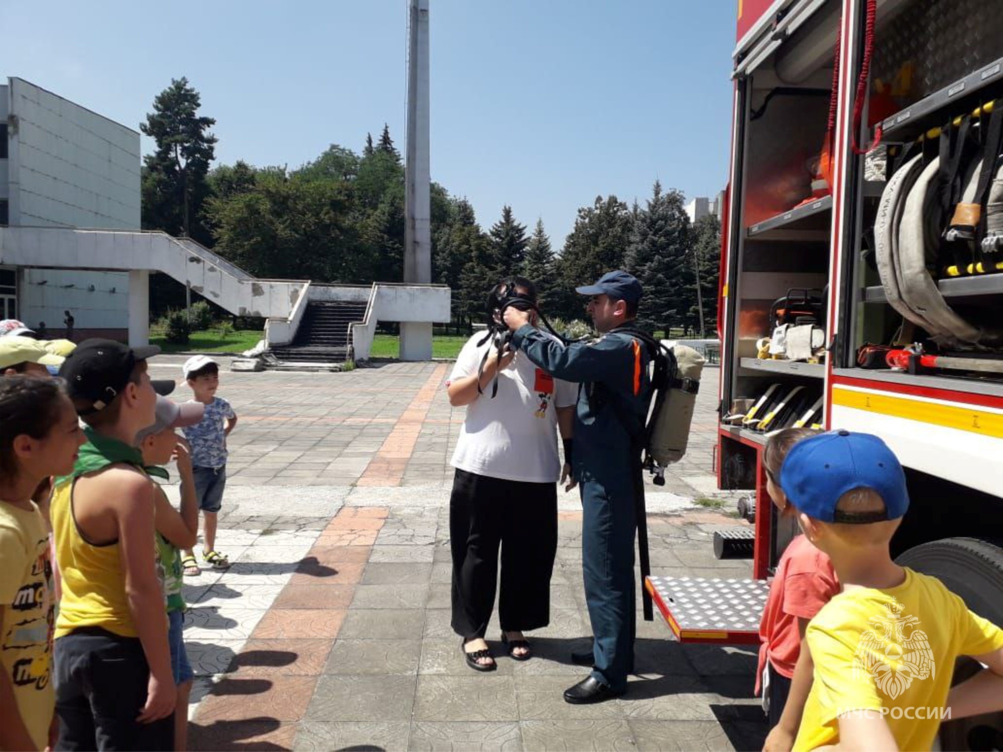 На территории Дворца творчества огнеборцы пожарно-спасательной части № 1 продемонстировали действия дежурного караула по боевому развертыванию отделения. Пожарные быстро открыли отсеки пожарного автомобиля, достали развернули пожарные рукава, соединили с автоцистерной, подали огнетушащее вещество и потушили условный пожар. Затем дети смогли посмотреть и ознакомиться с пожарно-спасательной техникой и его оборудованием: посидеть за рулем пожарного автомобиля, узнать о ее тактико-технических характеристиках, надеть боевую одежду пожарного и сфотографироваться с профессиональными огнеборцами на память.