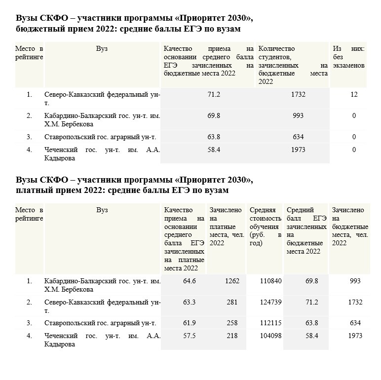 Среди вузов СКФО – участников программы «Приоритет-2030» КБГУ по качеству приема зачисленных в 2022 году на бюджетные места занимает второе место, уступая Северо-Кавказскому федеральному университету 1,4 среднего балла ЕГЭ.