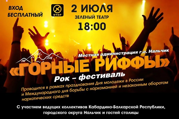 В честь празднования Дня молодёжи в России и Международного дня борьбы с наркоманией и незаконным оборотом наркотических средств в Нальчике 2 июля в Зеленом театре пройдет Рок-фестиваль «Горные рифы».