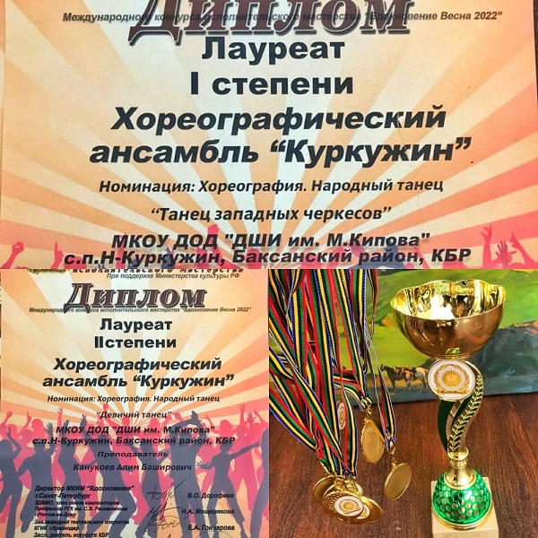 Хореографический ансамбль «Куркужин» детской школы искусств им. М. Кипова занял первое место в номинации «Хореография. Народный танец» исполнив «Танец западных черкесов» и второе место в той же номинации исполнив «Девичий танец».