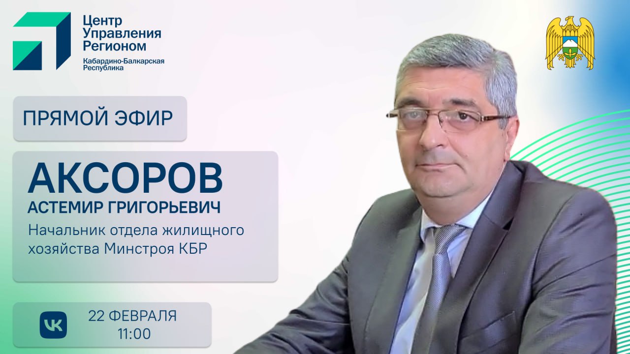 На этой неделе гостем станет начальник отдела жилищного хозяйства Минстроя КБР Астемир Аксоров. Трансляция прямого эфира состоится 22 февраля в 11:00 на площадке официального сообщества Министерства строительства и жилищно-коммунального хозяйства КБР во «ВКонтакте».