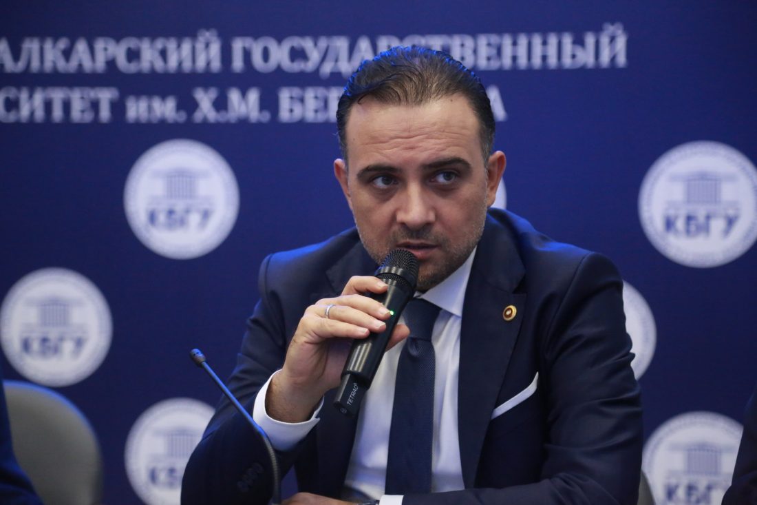 Разговор продолжился в Зале заседаний ученого Совета КБГУ. Открывая встречу, президент Международной Черкесской Ассоциации, член попечительского совета КБГУ Хаути Сохроков поприветствовал участников встречи и отметил, что оказание содействия молодым зарубежным соотечественникам в получении высшего и среднего профессионального образования в вузах Кабардино-Балкарской Республики является одной из приоритетных задач. Напомнил о том, что недавно при поддержке Фонда Горчакова была проведена научно-практическая конференция по вопросам российско-турецких взаимоотношений в глобальных геополитических процессах, все участники которой были единодушны в стремлении сближения двух стран.