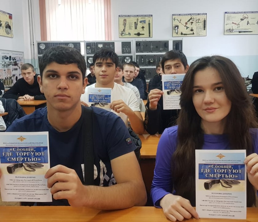 В рамках второго этапа Общероссийской акции «Сообщи, где торгуют смертью» сотрудники Управления по контролю за оборотом наркотиков МВД по Кабардино-Балкарской Республике и инспекторы по делам несовершеннолетних УМВД России по г.о. Нальчик побывали в четырех образовательных учреждениях республики - Нальчикском колледже легкой промышленности, торгово-технологическом и двух филиалах автомобильно-дорожного колледжа.