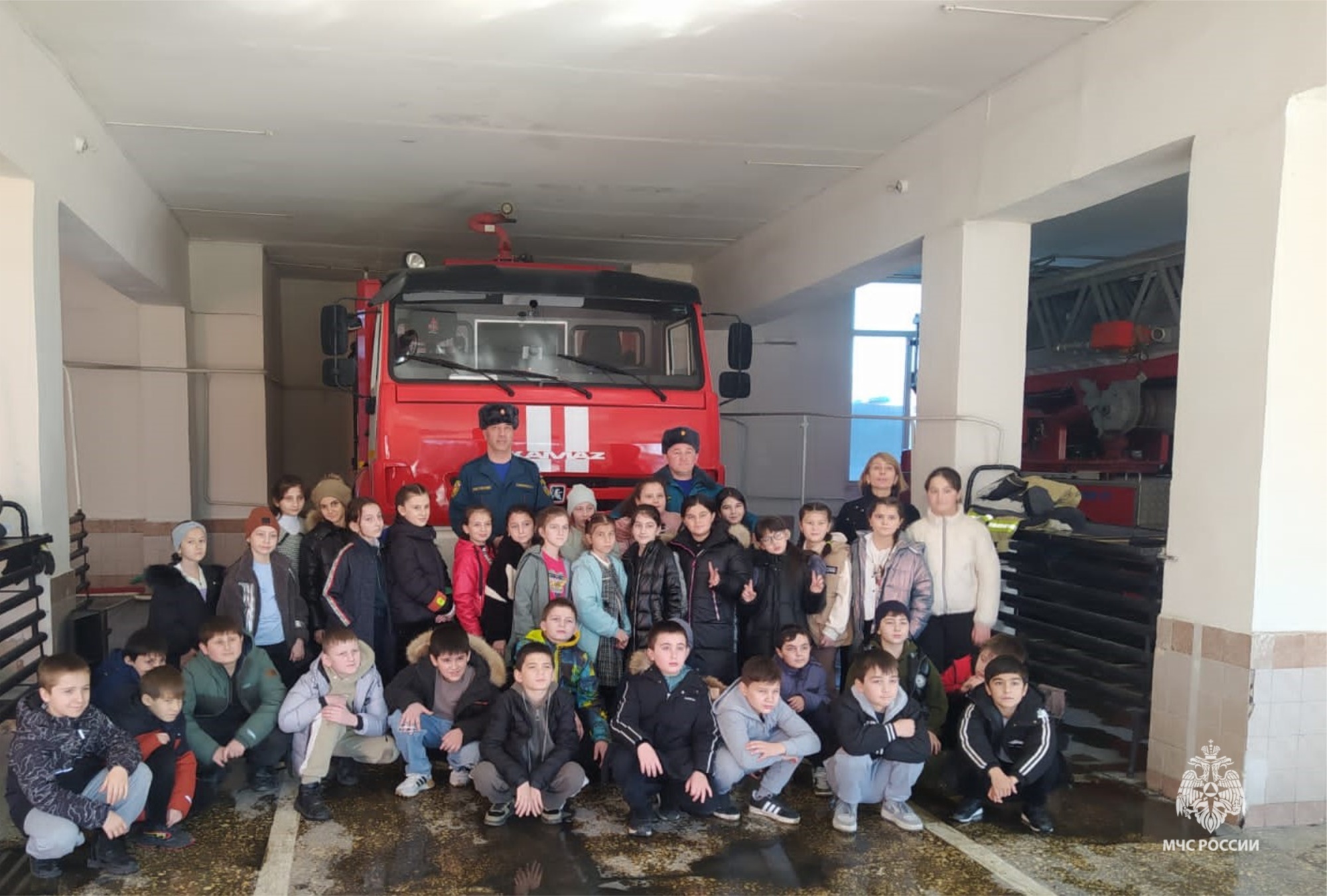 В гости к огнеборцам специализированной пожарно-спасательной части по тушению крупных пожаров с ознакомительной экскурсией пришли воспитанники школы №1 города Чегем .