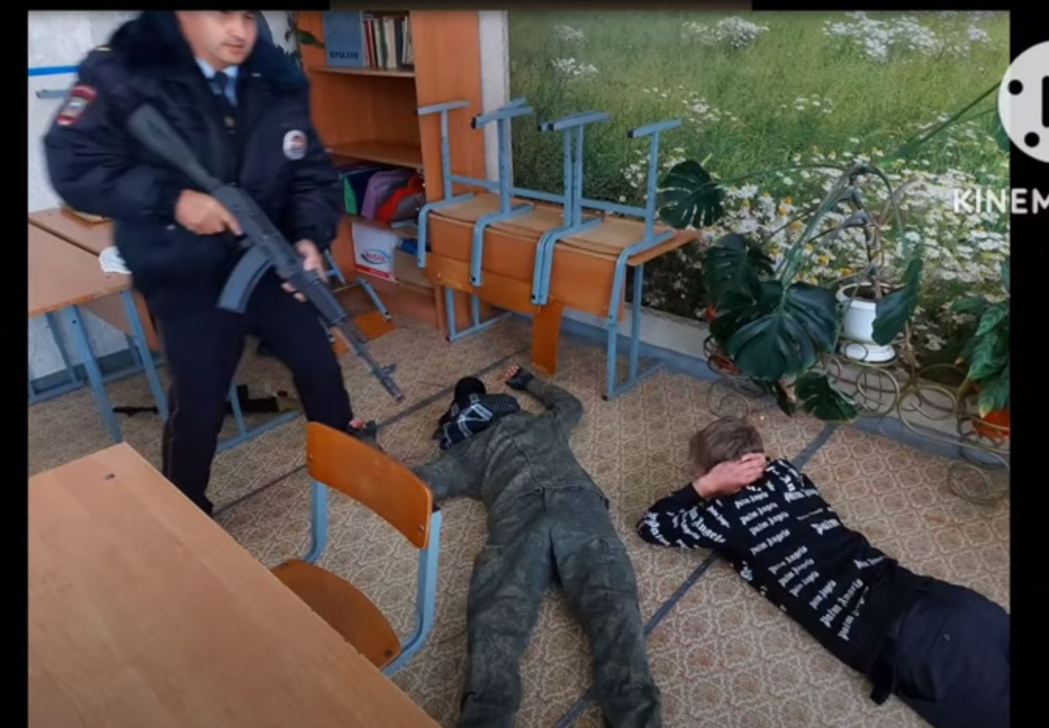 На видео видно, как в класс врываются люди с закрытыми лицами и в камуфляже, целятся в учеников из автоматов и сгоняют их к окну, грубо выкрикивая команды: «Руки за голову! Встать к окну! Быстро!» . Также Емельянова опубликовала несколько фото: на одном учащиеся лежат на полу, держа руки на затылке, на другом — человек в камуфляже наводит на школьников оружие или муляж, на третьем — взрослый мужчина в полицейской форме направляет автомат на детей, лежащих на полу. Также есть групповое фото, где учащиеся, учителя и «террористы» дружно стоят у доски, видимо, после успешного завершения учений.