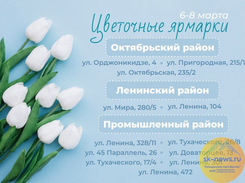 Глава Ставрополя Иван Ульянченко рассказал SK-NEWS.RU : «Город-сад – Ставрополь завтра в очередной раз оправдает свое второе название. Мы организовали цветочные ярмарки по всему городу, чтобы в шаговой доступности обеспечить горожан готовыми букетами, чтобы каждый мужчина мог поздравить любимых женщин с Международным женским днем. Торговые площадки будут работать до 8 марта включительно. Регистрация участников, желающих реализовать свою цветочную продукцию, продолжается до конца рабочего дня 5 марта».