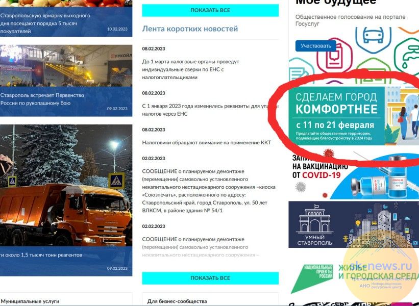 Их можно оставить в комитете городского хозяйства на улице Дзержинского,116 в/1. На официальном сайте администрации Ставрополя предложения примут, если кликнуть на баннер справа «Сделаем город комфортнее». Участники опроса могут предложить свой вариант территории для благоустройства в 2024 году. Инициативы ставропольцев ждут до 21 февраля 2023 г.