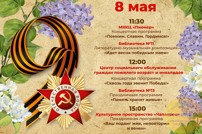 Встреча с ветераном Татьяной Васильевной Стадник, выступление творческих коллективов «Хорошее настроение», «Дубравушка», солистов вокальной группы «Вереск» и барда Татьяны Павловой состоится 8 мая в культурном пространстве «Чапаевец». Начало праздничной программы «Ваш подвиг жив, неповторим и вечен»в 15.00.