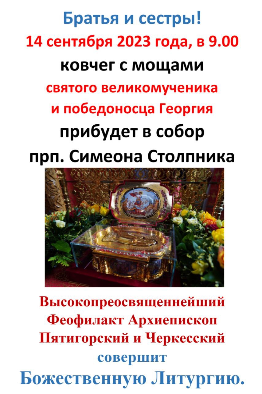 ОБЪЯВЛЕНИЕ: ковчег с мощами святого великомученика и победоносца Георгия пробудет в соборе прп. Симеона Столпника г. Нальчика 2 дня, 14 и 15 сентября.