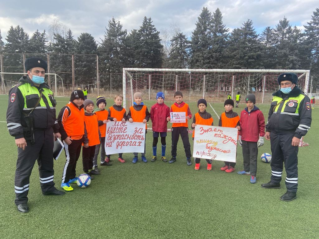 \nЮные футболисты поддержали идеи безопасности и сделали селфи с плакатами с призывными лозунгами «Мы вместе за безопасность на дорогах», «Знает каждый пешеход безопасный переход».