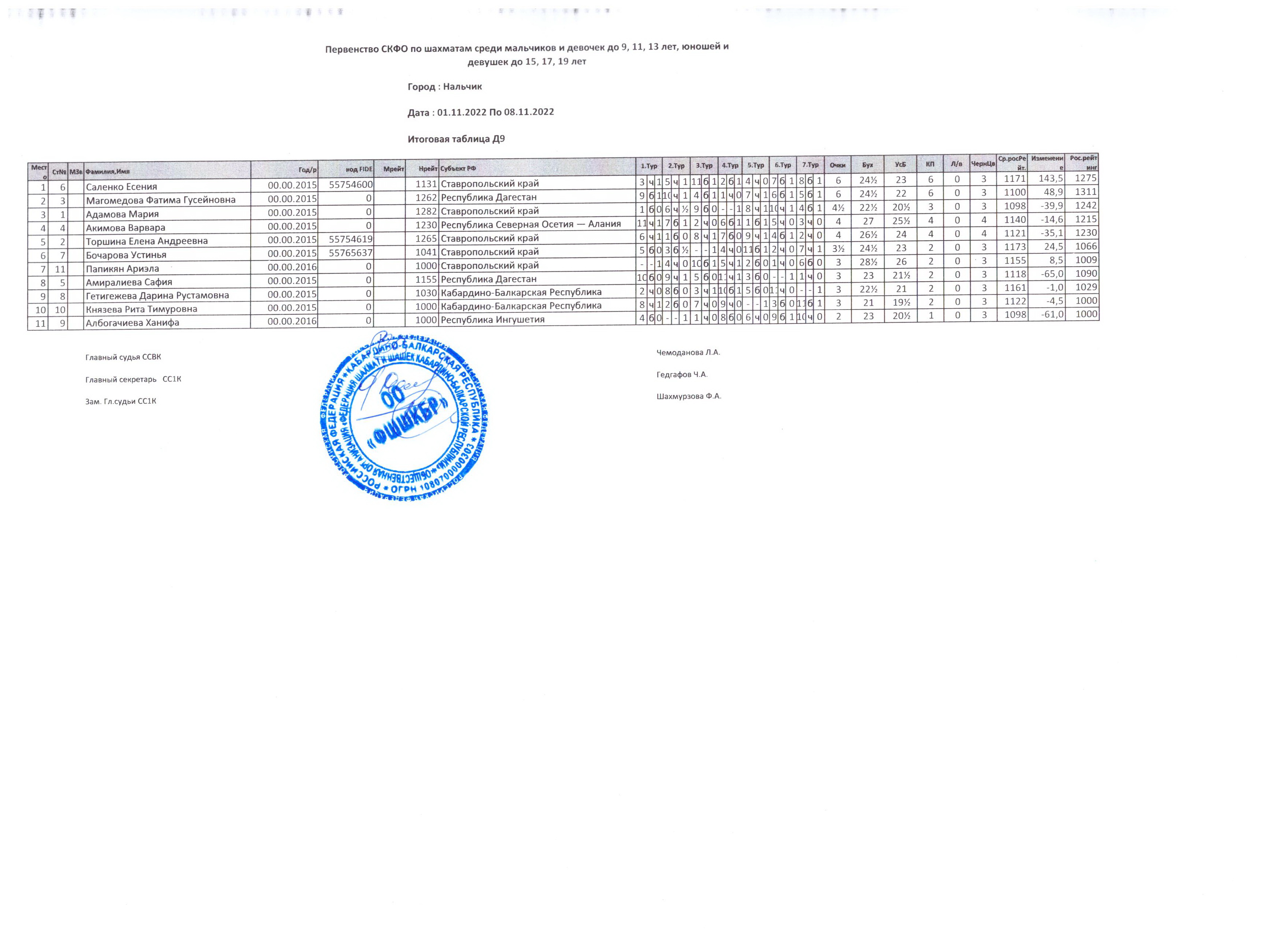 Итоговые таблицы Первенства СКФО-2022 по шахматам среди детей и юношества