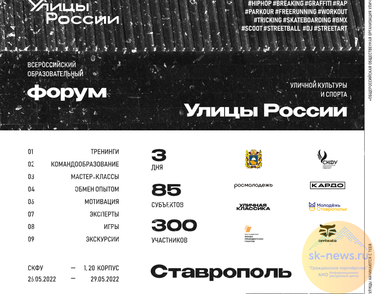 Раньше мероприятие было частью финала Международной конкурса-премии «КАРДО». Всероссийский образовательный форум уличной культуры и спорта «Улицы России» пройдет с 26 по 29 мая в СКФУ. Главная тема – профессиональное развитие гибких навыков менеджеров и деятелей уличных культур. Из 85 субъектов Российской Федерации в Ставрополь приедут управленцы, атлеты и менеджеры в направлениях BMX, брейкинг, диджеинг, фриран, граффити, хип-хоп, паркур, рэп, скейтбординг, скут, трикинг, воркаут и стрит-арт.