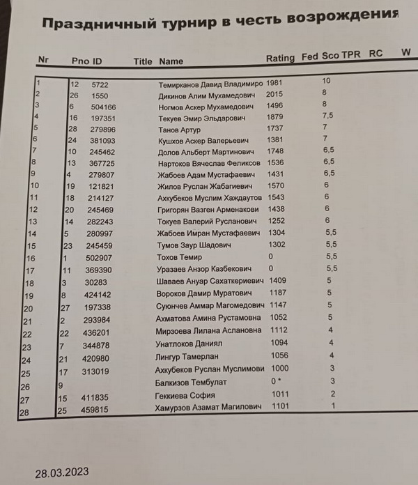 28 марта в «Каиссе» состоялся турнир, посвященный Дню возрождения балкарского народа. Перед началом турнира выступил ветеран шахмат республики Ануар Шаваев, который рассказал участникам о значении это праздника и пожелал всем мира и добра. Организатор турнира Муслим Ахкубеков отметил, что данный турнир проводится в рамках укрепления дружбы между народами.