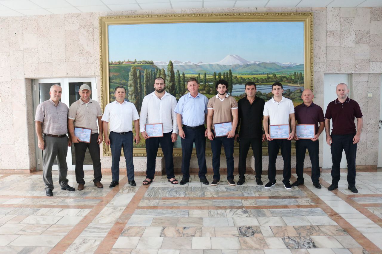 Исполняющий обязанности главы администрации Терского района Асланби Хуштов вручил Сертификаты на получение денежного вознаграждения Марату Кампарову, ТембулатуАбазову, Асланбеку Кишеву и их тренерам,