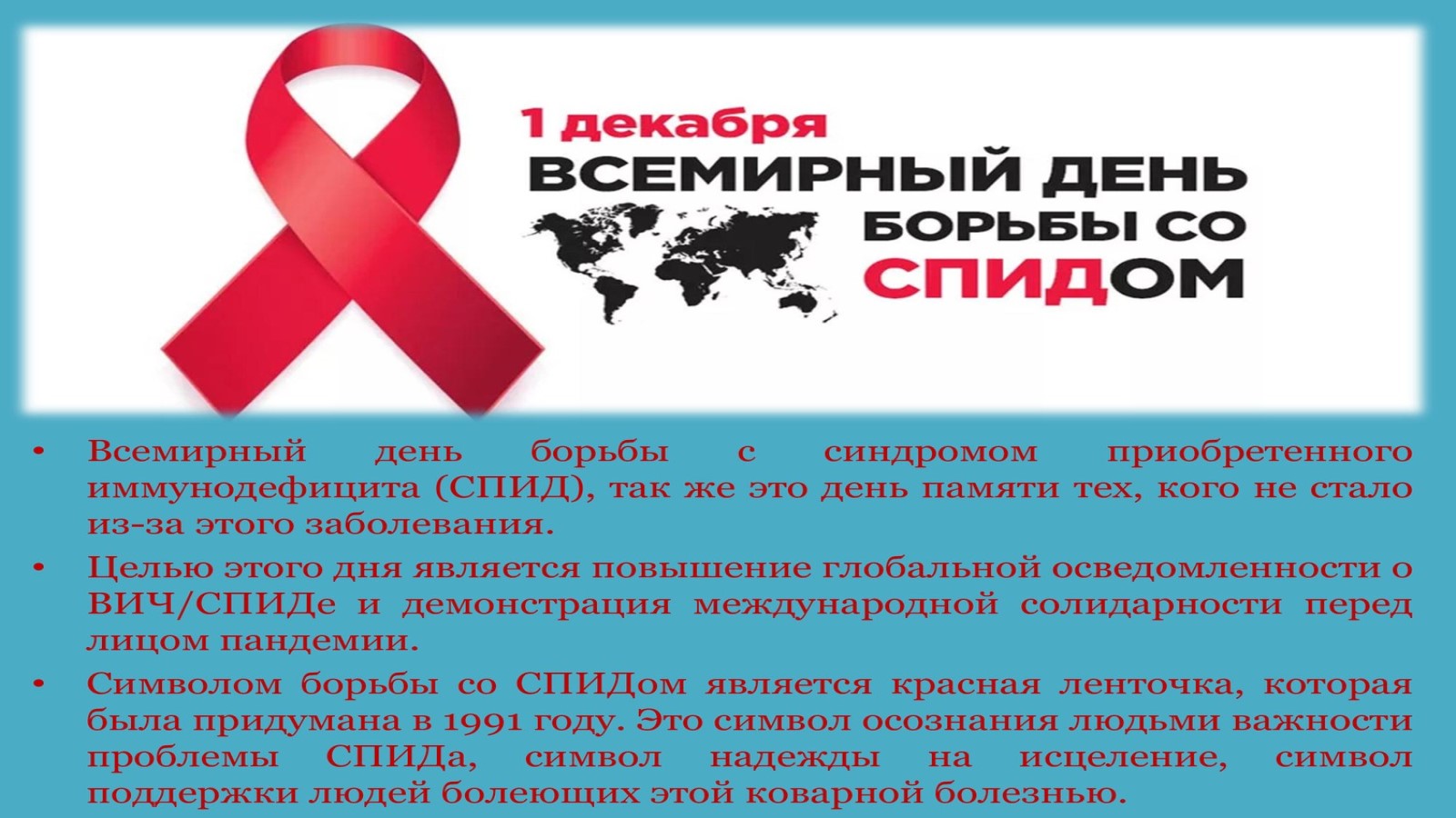 1 декабря во всём мире отмечается Всемирный день борьбы со СПИДом
