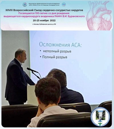 На ХХVIII Всероссийском съезде сердечно-сосудистых хирургов, посвященному 100-летию со дня рождения выдающегося кардиохирурга, создателя большой научной школы академика РАМН Владимира Бураковского, сердечно-сосудистый хирург ГБУЗ РКБ - Ахмед Куготов, под руководством профессора Асланова А.Д., выступил с докладом на тему: «Тактика лечения истинных аневризм селезеночной артерии».
